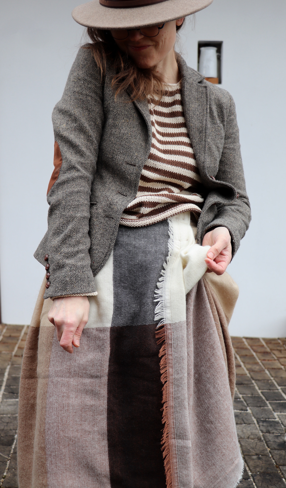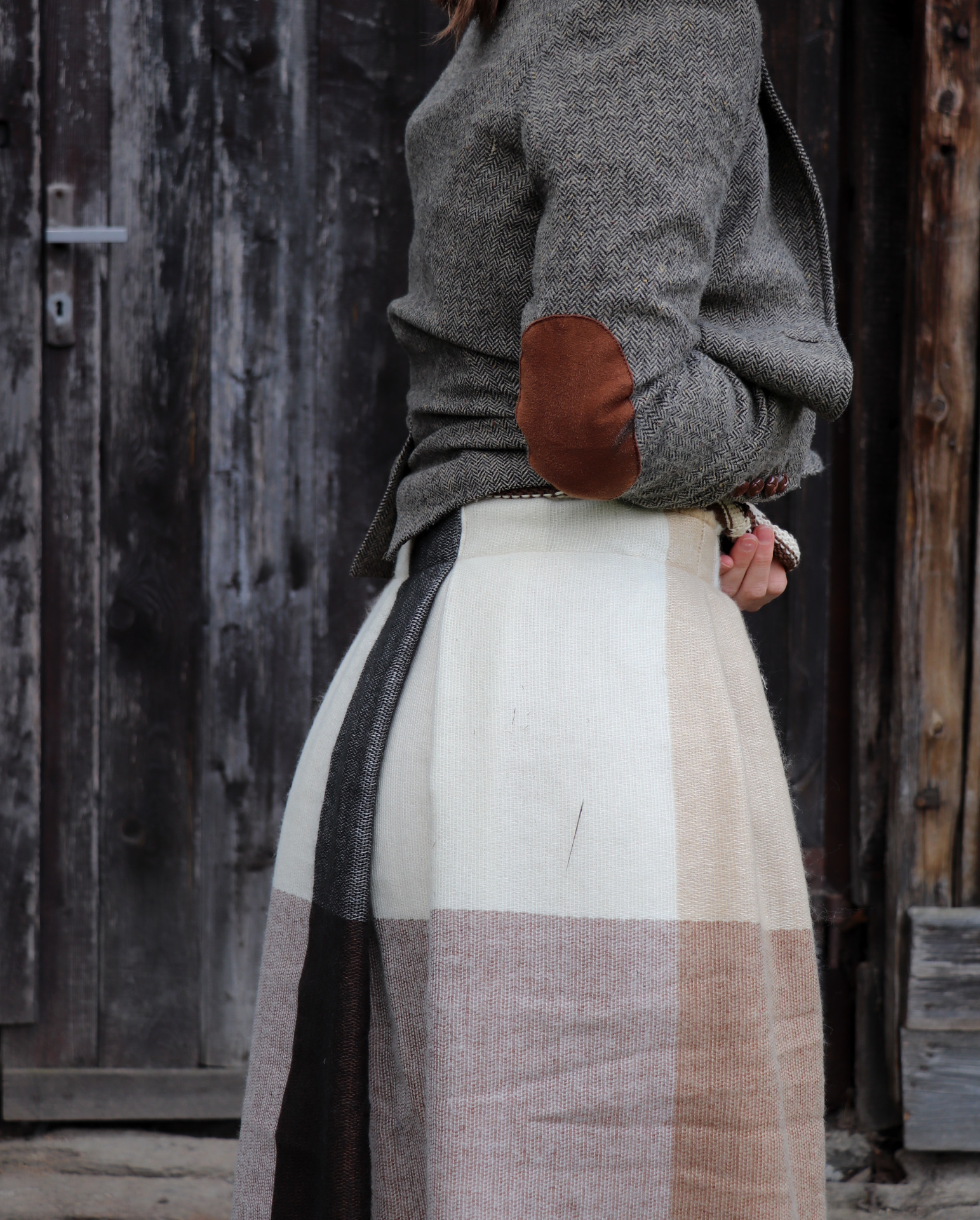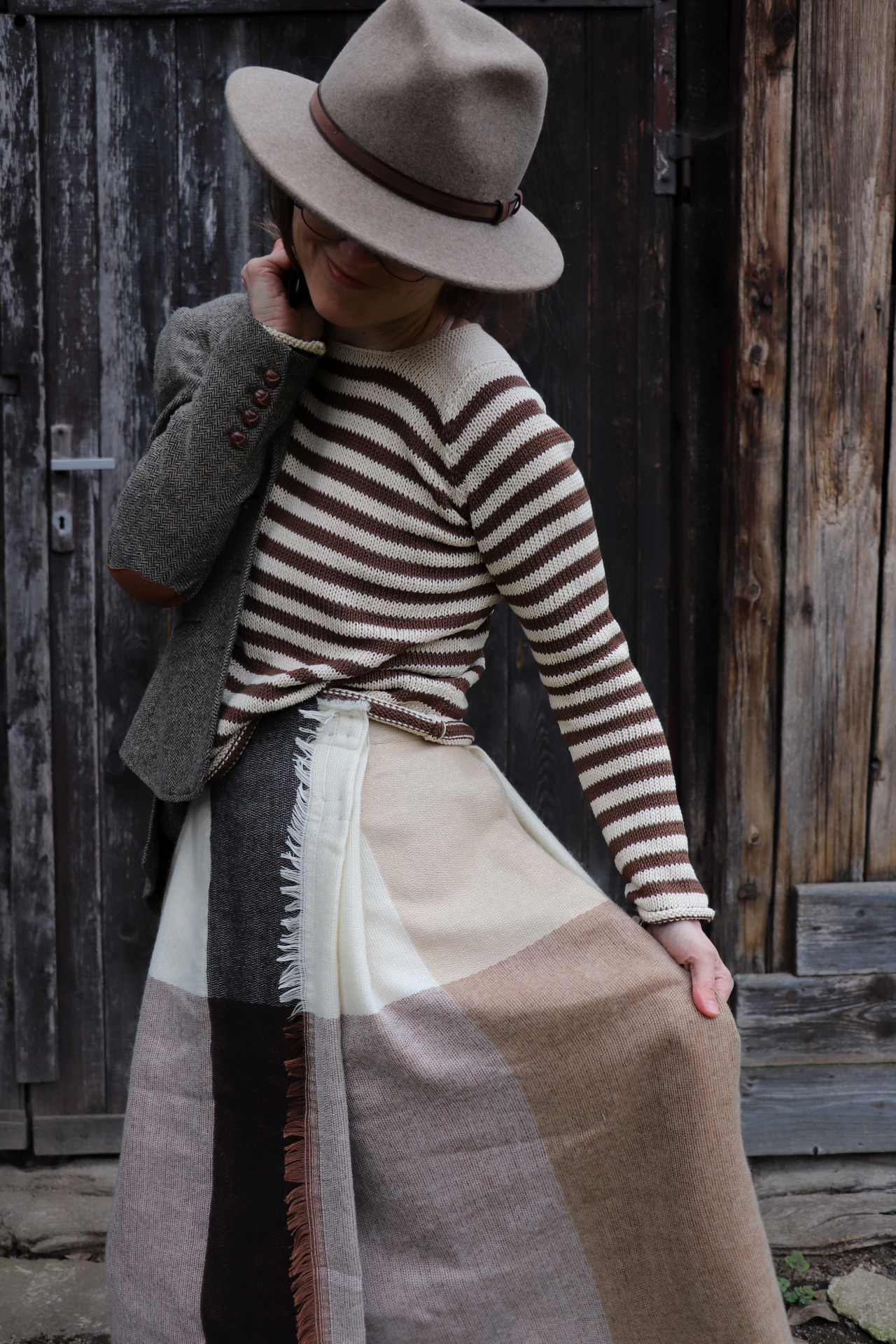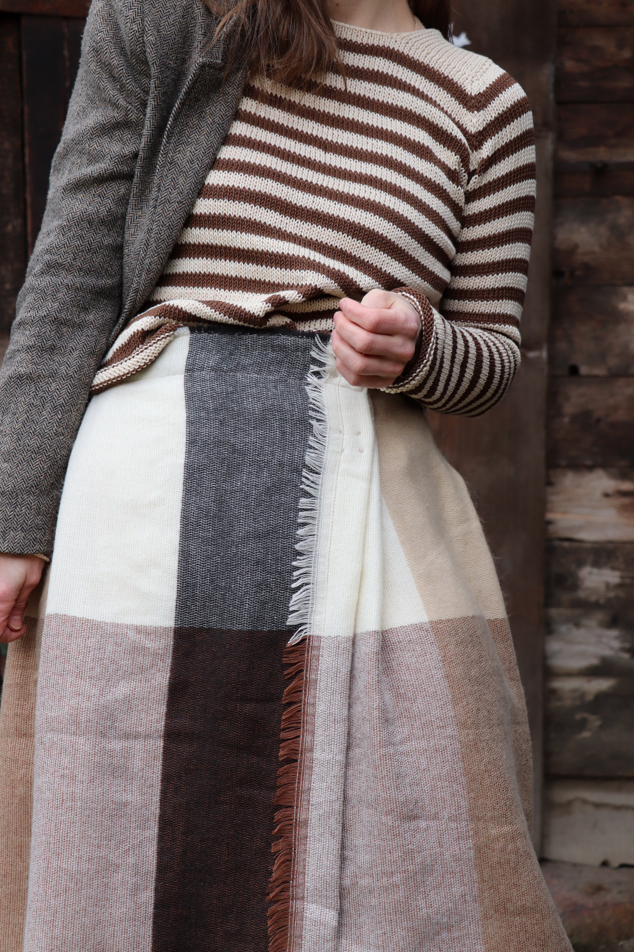 Z šály zavinovací skládaná sukně. Třepení z šály jsem záměrně zanechala.
