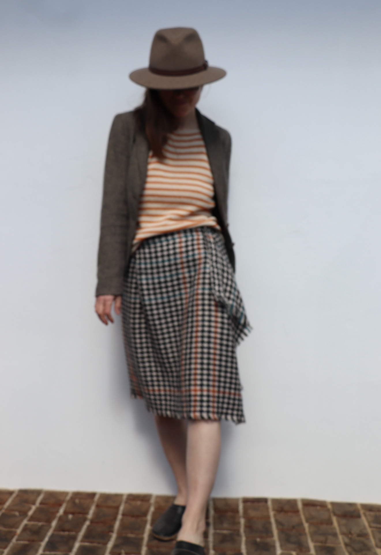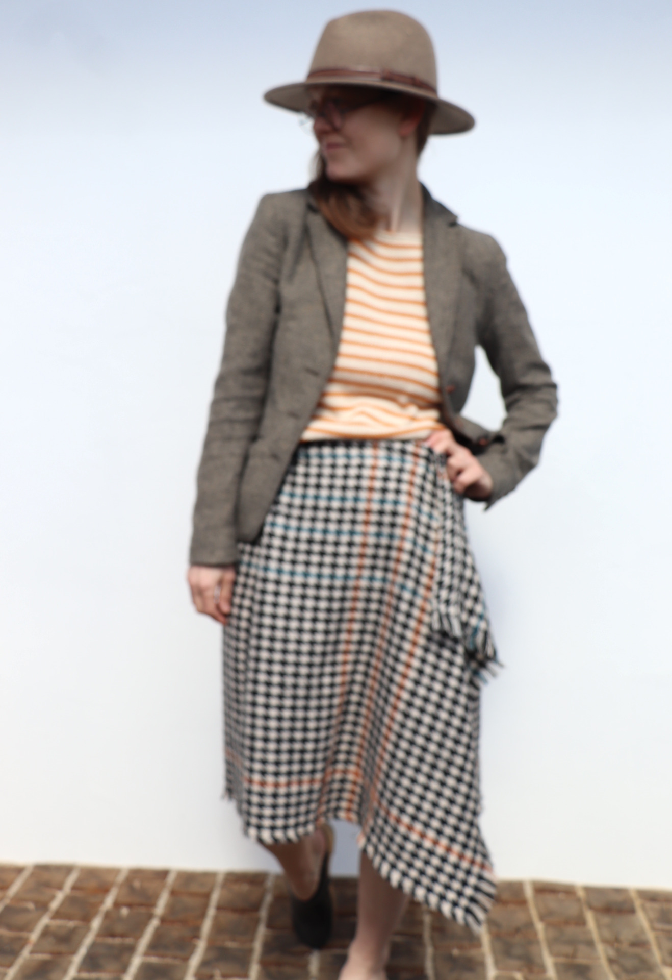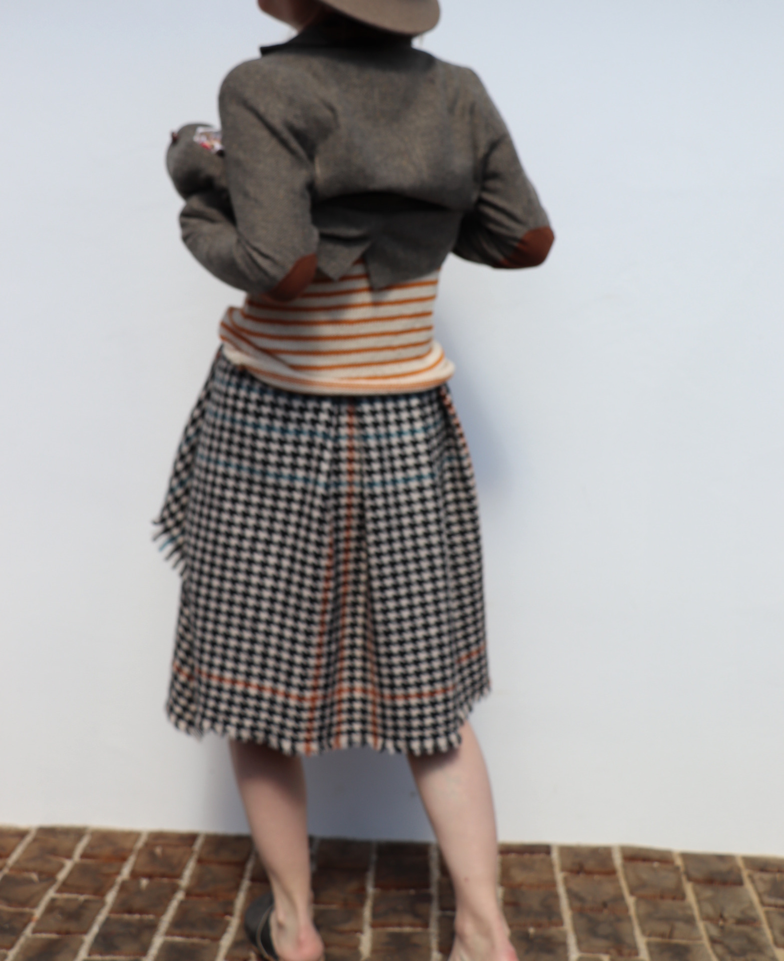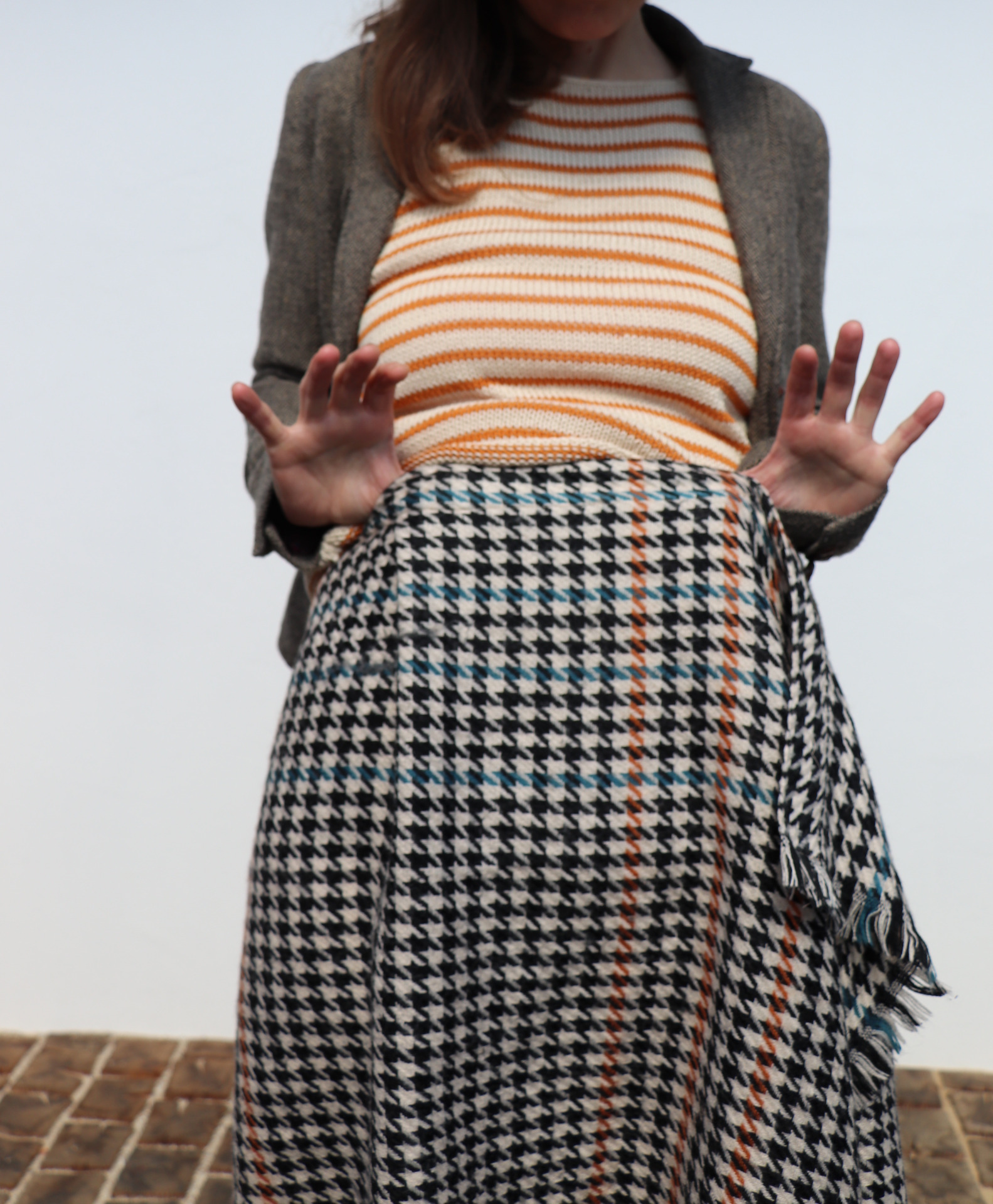 Z šály zavinovací skládaná sukně. Třepení z šály jsem záměrně zanechala.