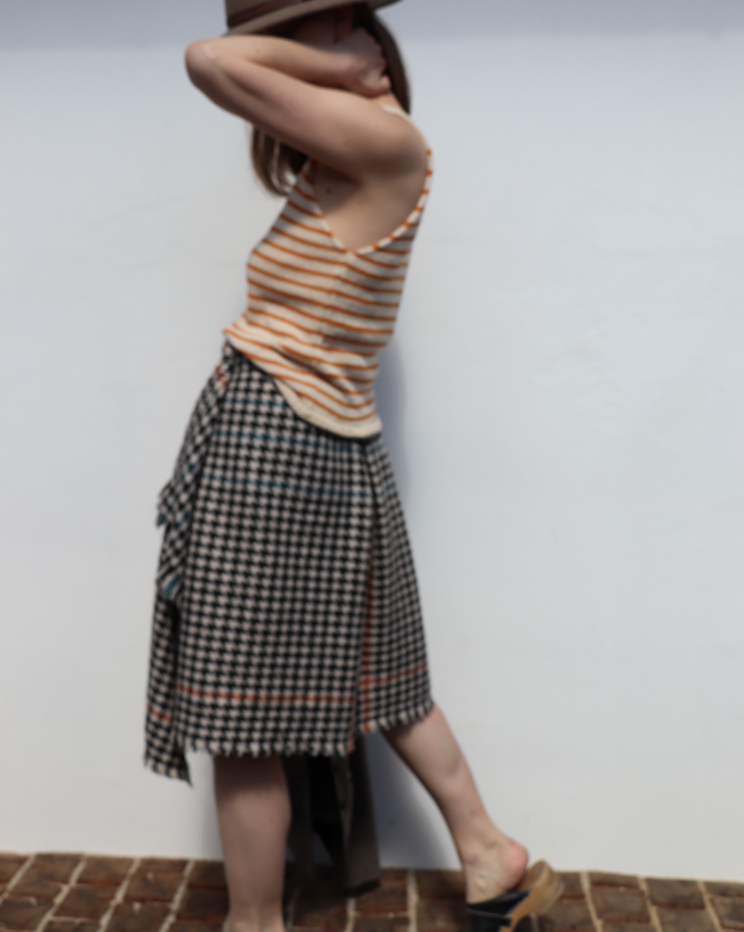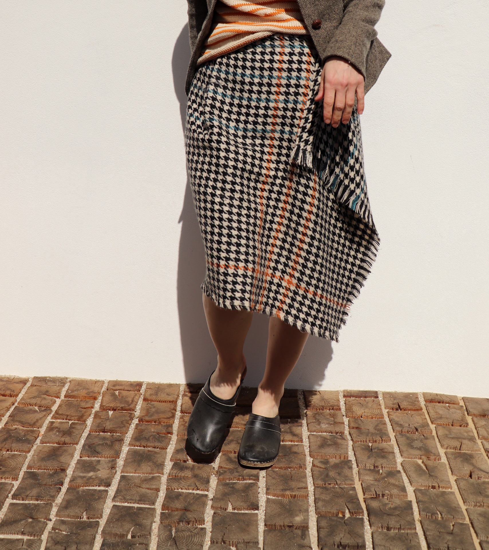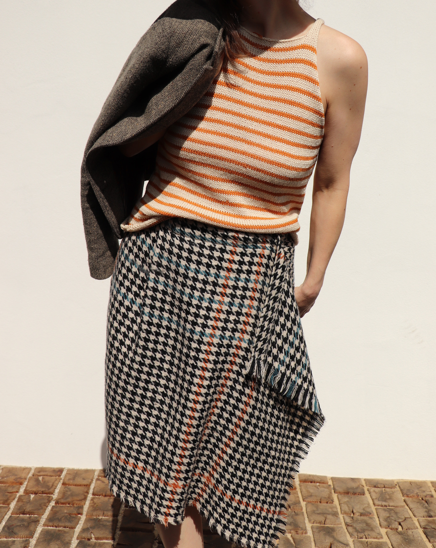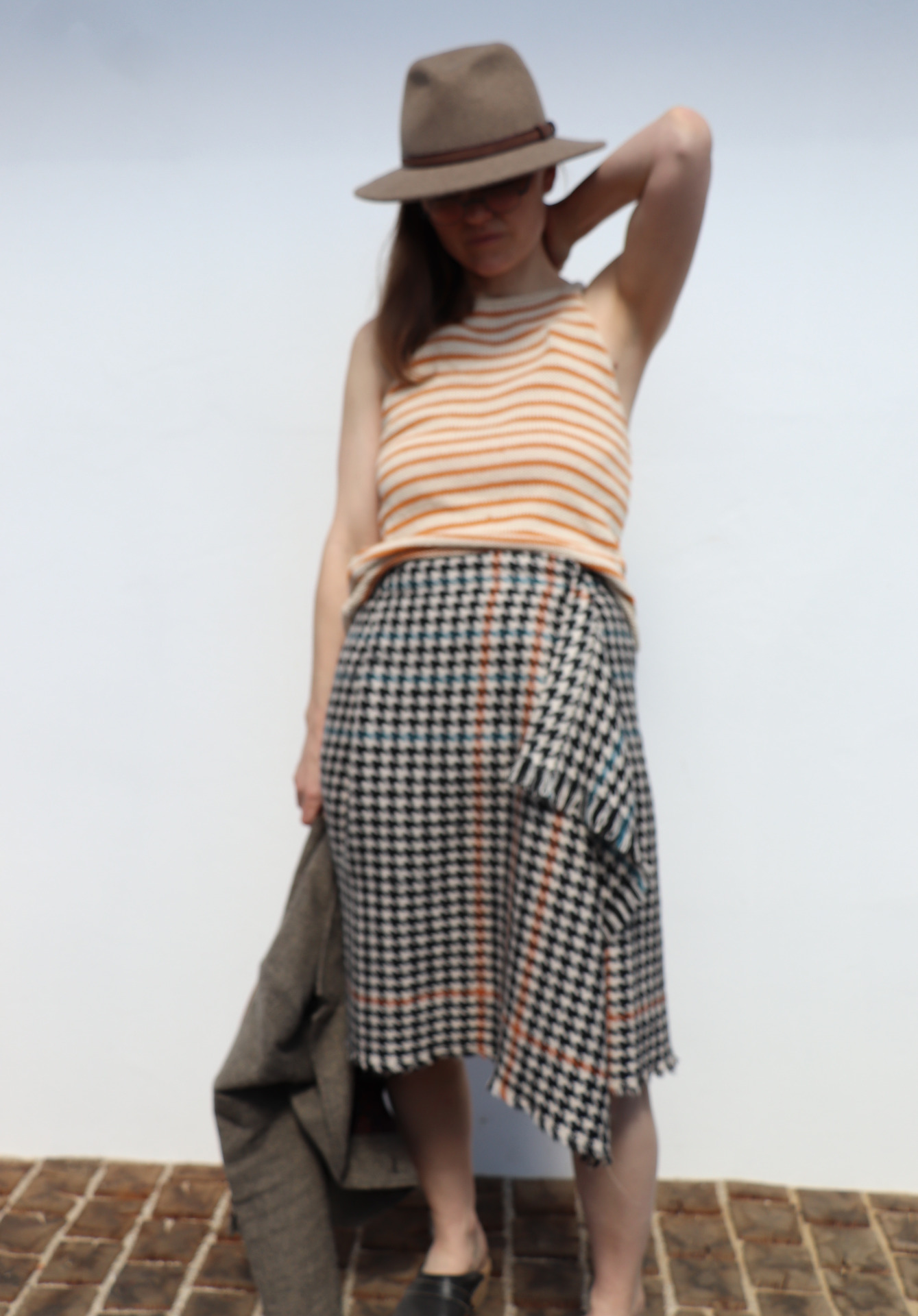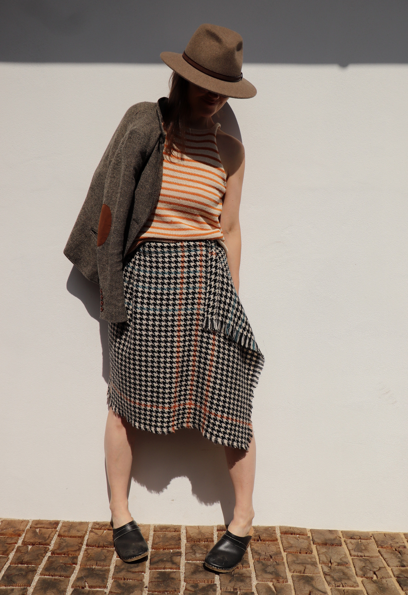 Z šály zavinovací skládaná sukně. Třepení z šály jsem záměrně zanechala.