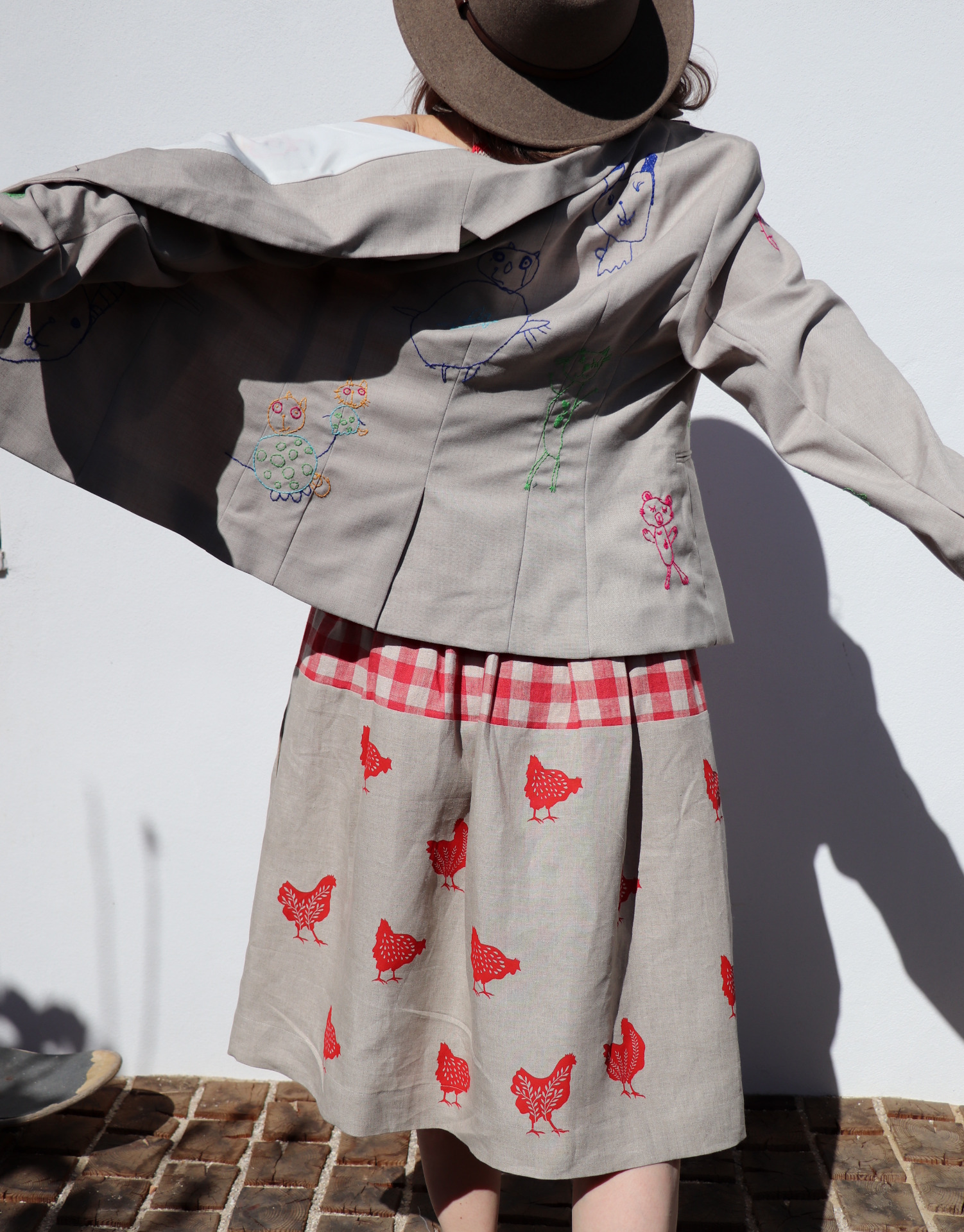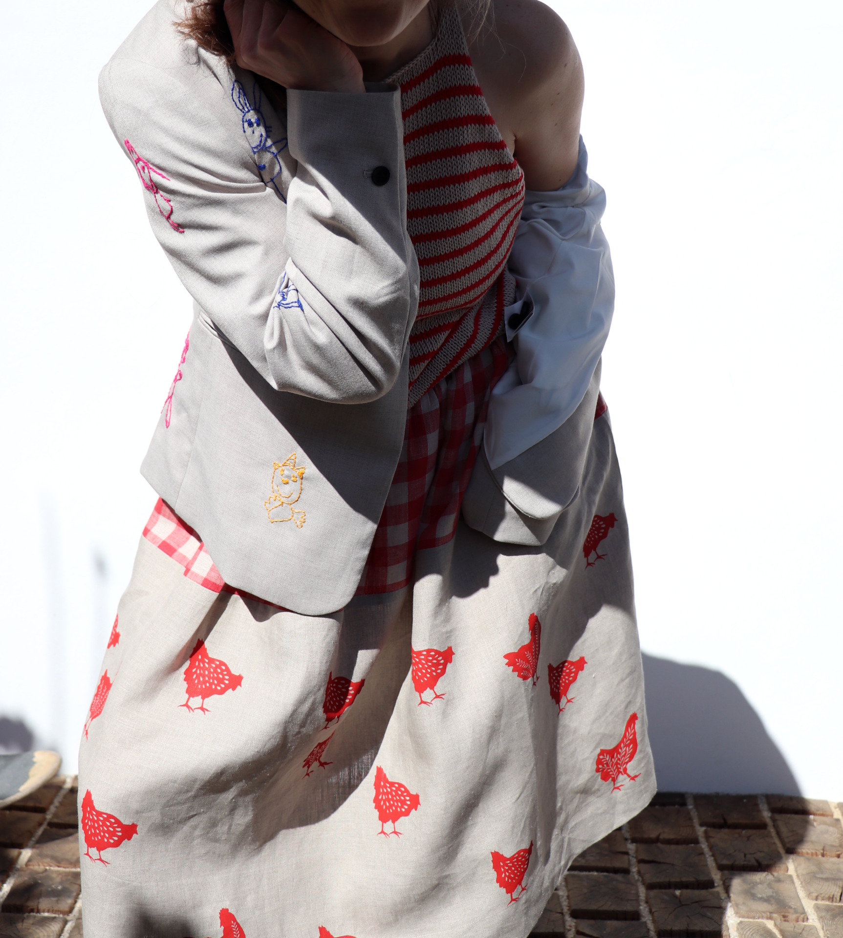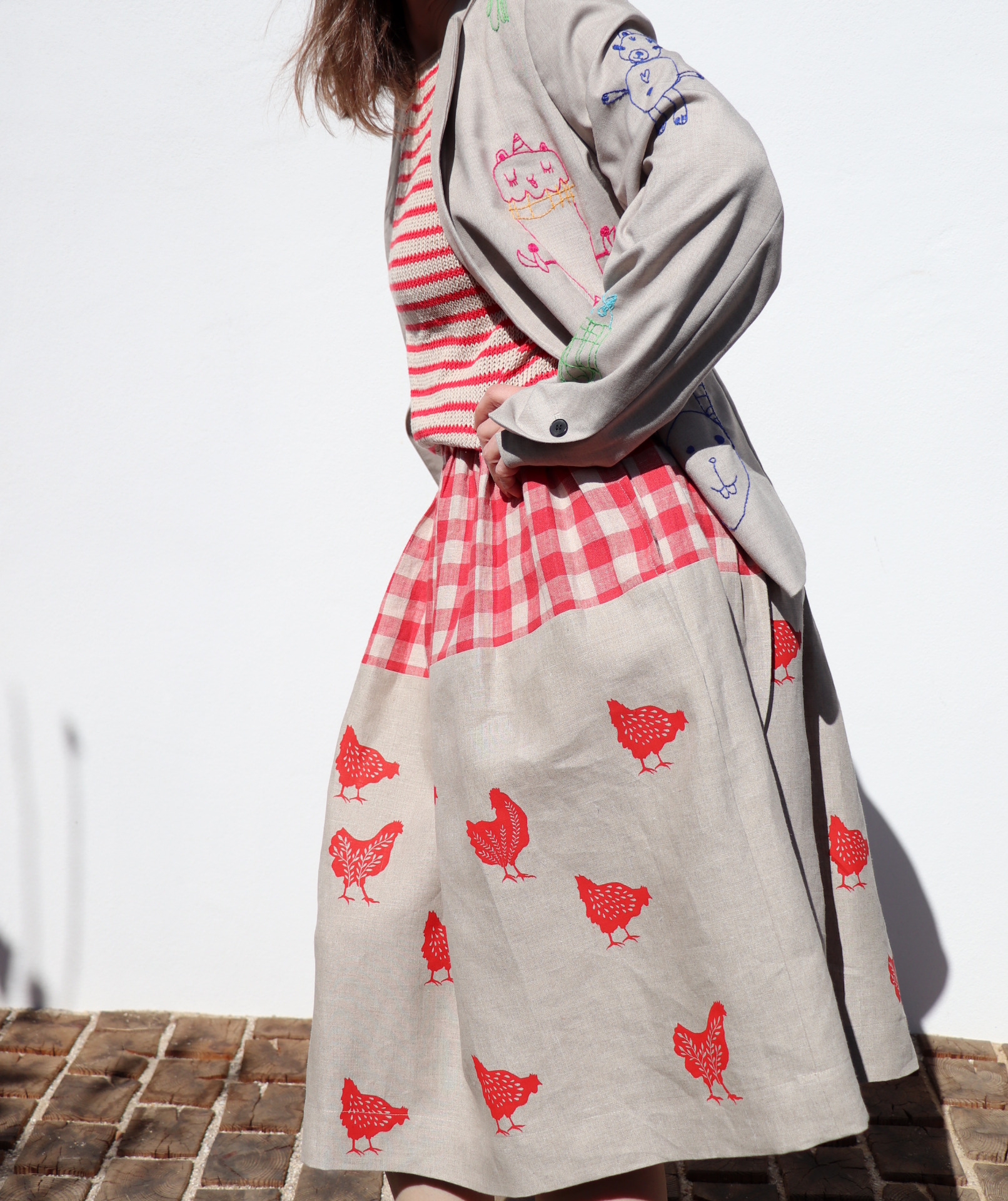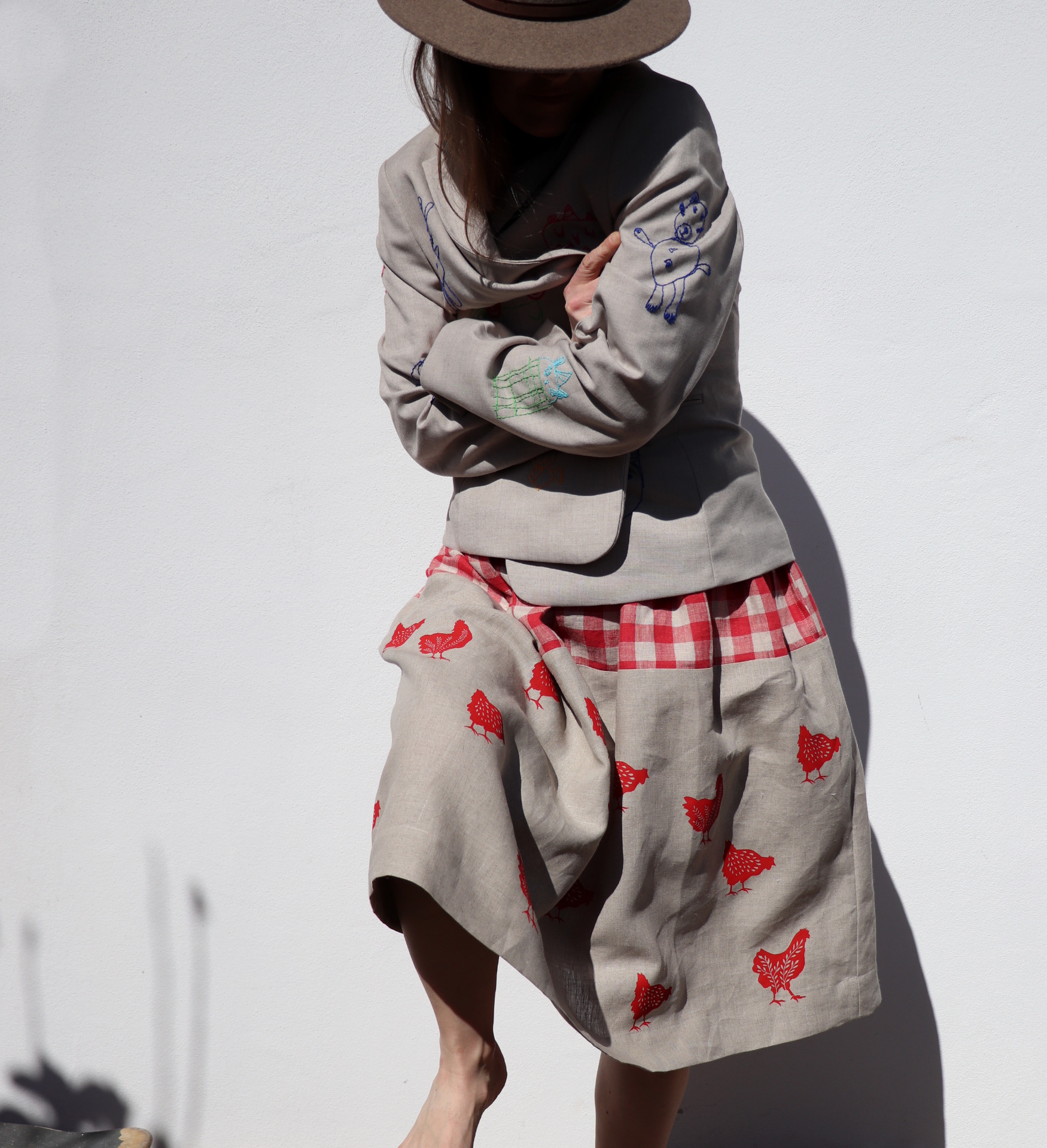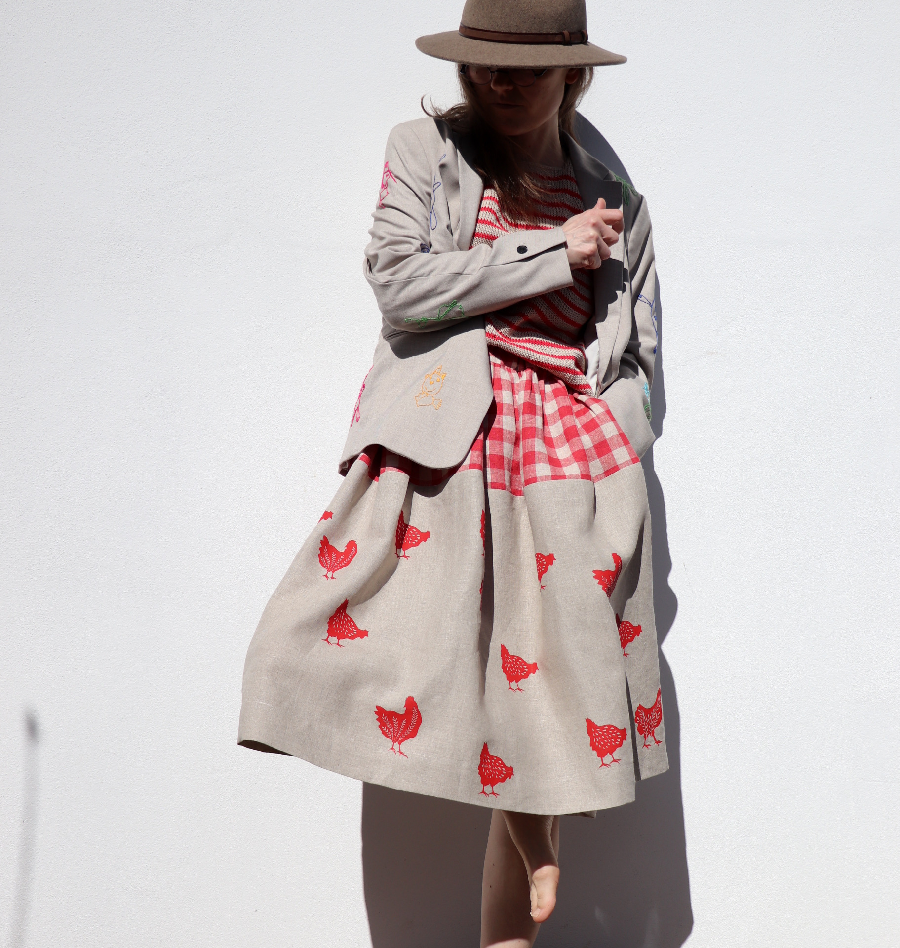 Dámská sukně ze dvou lnů, jeden nese autorský tisk slípek. Tiskla jsem barvou červenou technikou sítotisku