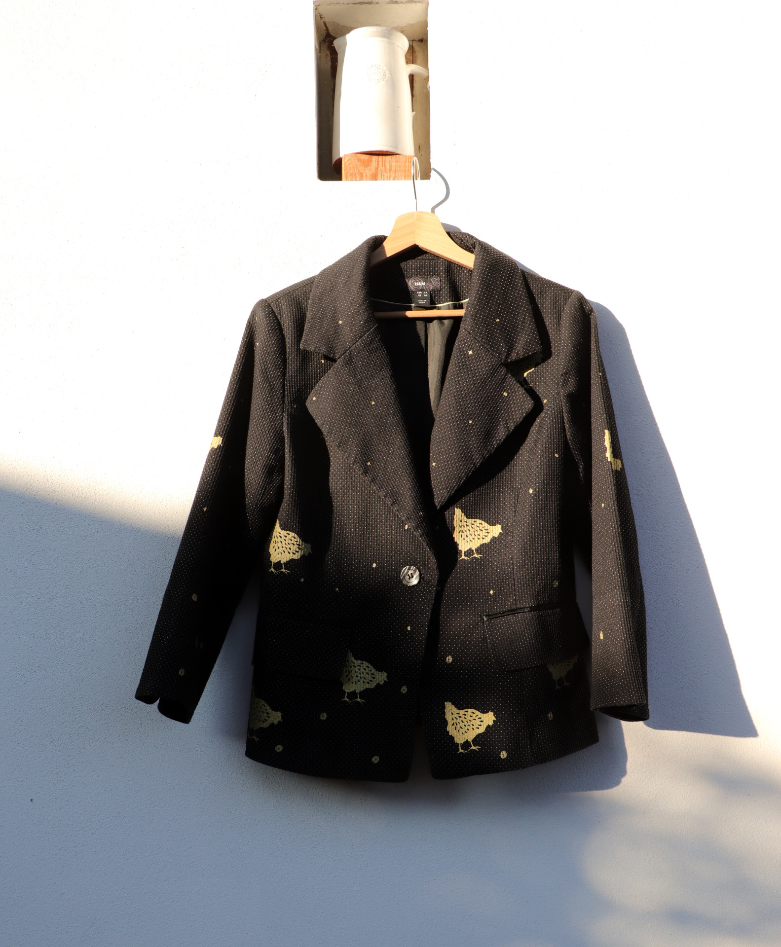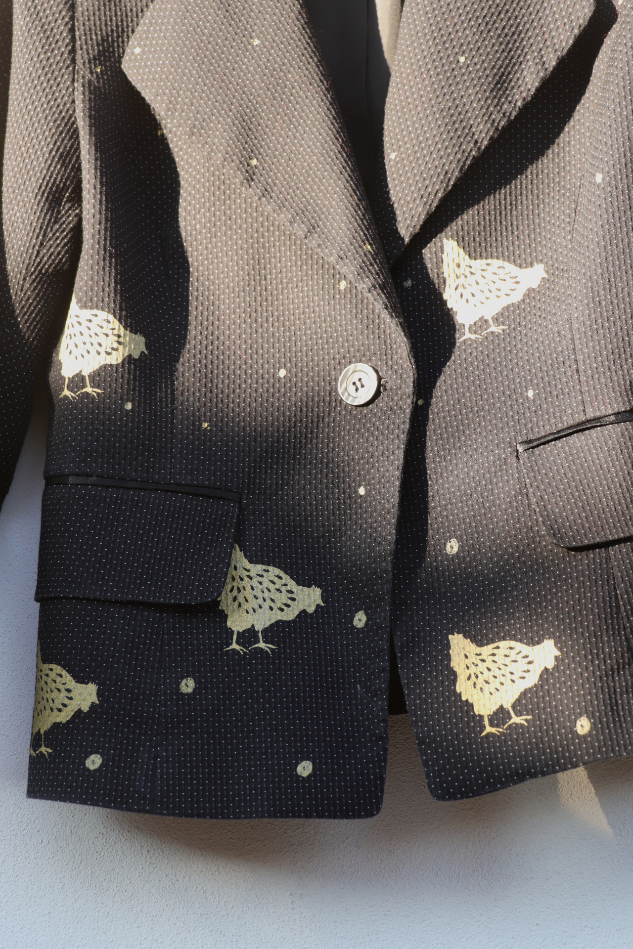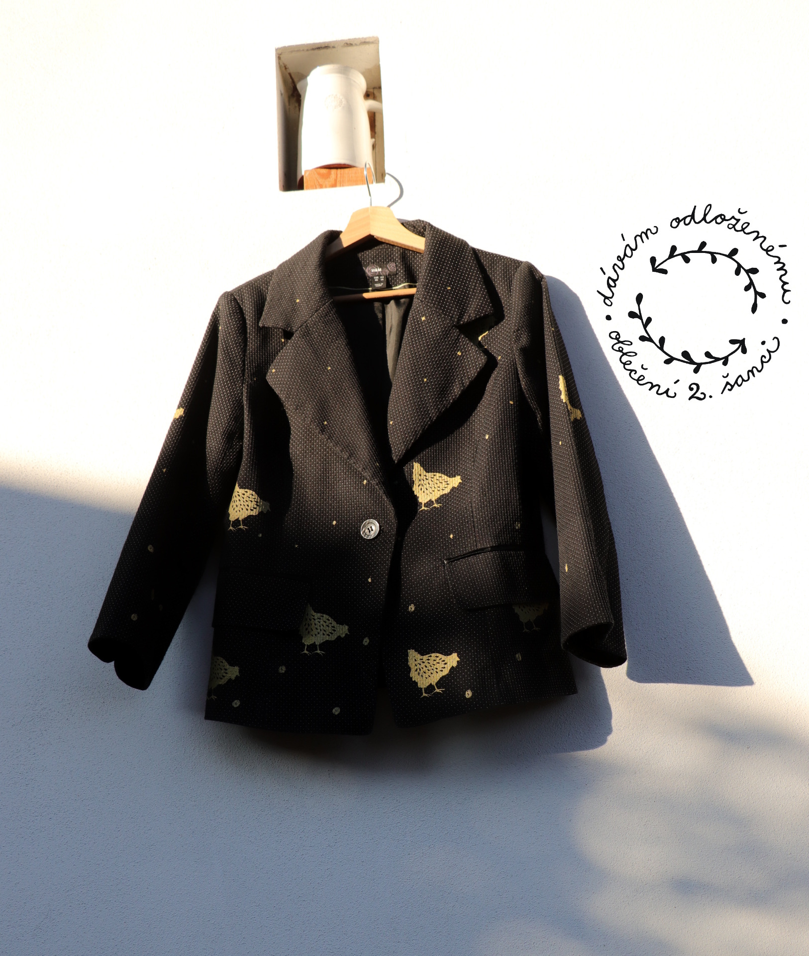 Potiskla jsem ho slípkami a puntíky, tisk zlatou barvou. Vzhledem ke struktuře saka, nevypadají na první pohled tisky ostře...proto mudávám šanci za rozumnou cenu
