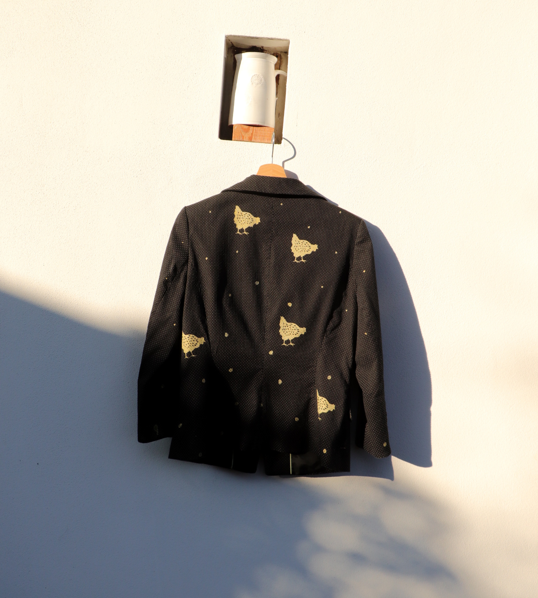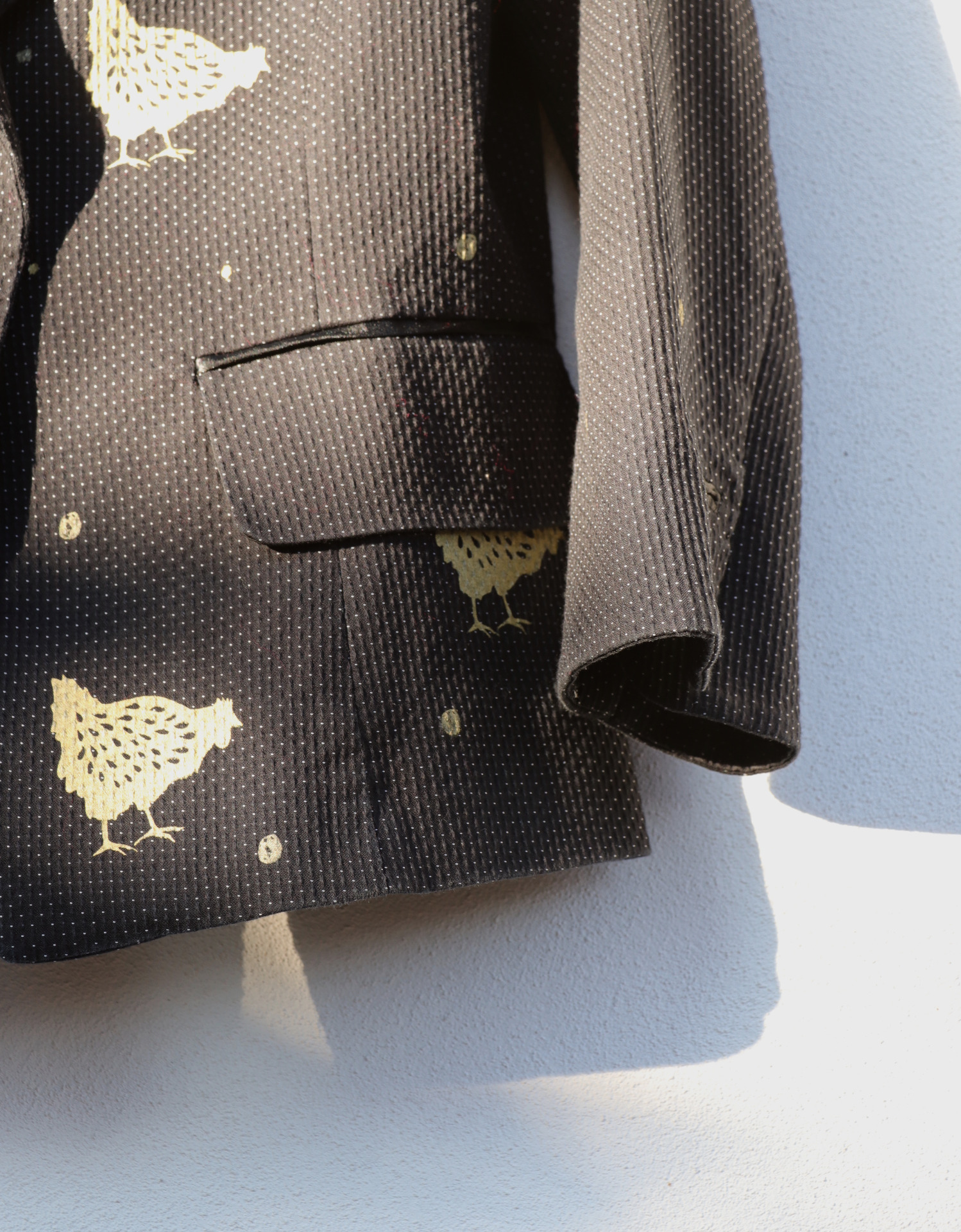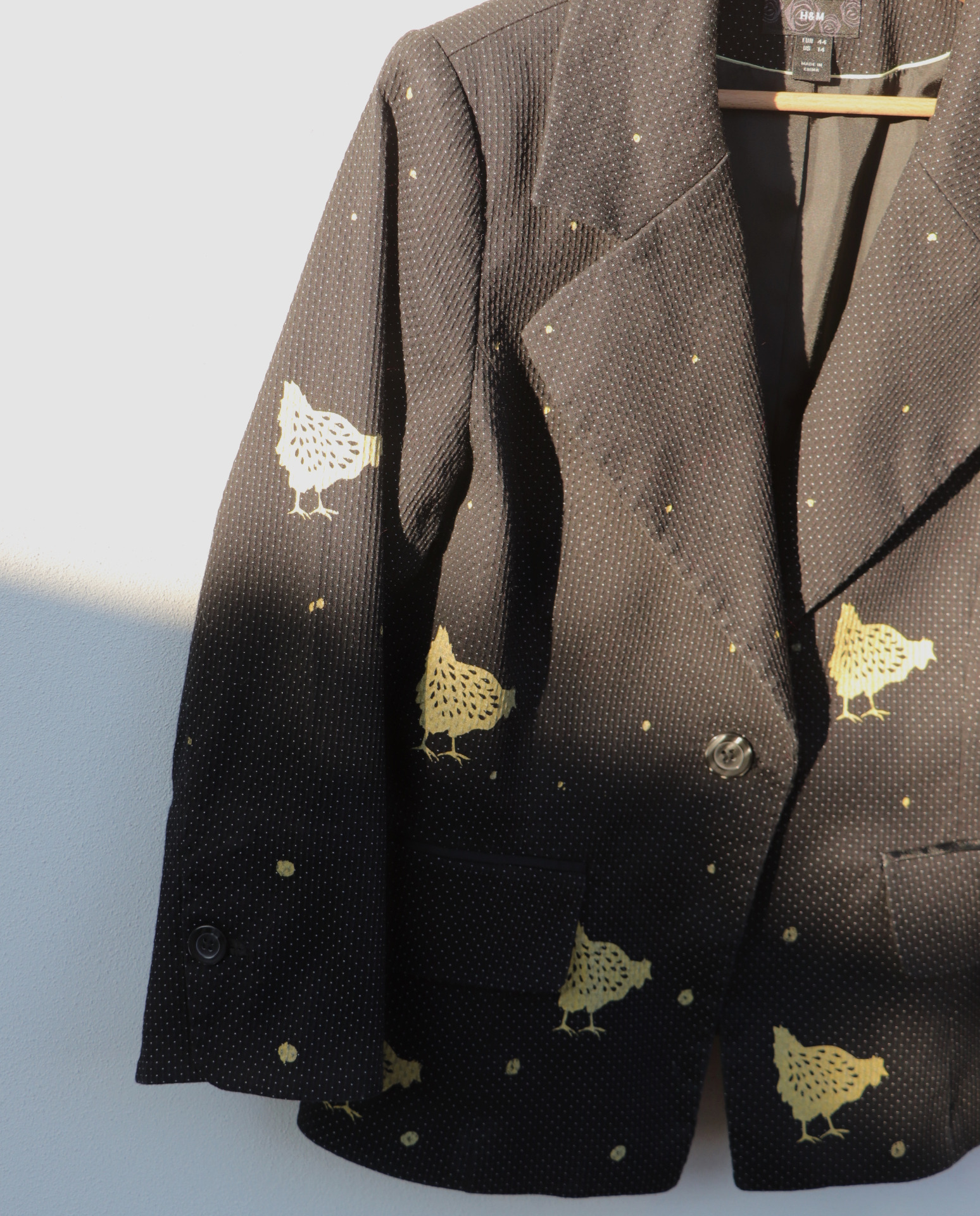 Potiskla jsem ho slípkami a puntíky, tisk zlatou barvou. Vzhledem ke struktuře saka, nevypadají na první pohled tisky ostře...proto mudávám šanci za rozumnou cenu